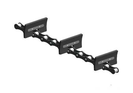 В качестве тягового органа применяется круглозвенная, пластинчатая, вильчатая, иногда катковая цепь с присоединенными к ней скребками. Скребки представляют из себя одинаковые по размеру, расположенные на равном расстоянии друг от друга вертикально ориентированные пластины - квадратные или прямоугольные, высокие либо низкие. Отдельный вид составляют контурные (фигурные) скребки. При использовании двух цепей они крепятся между ними, одной - присоединяются по бокам цепи. На выбор типоразмера цепей, их количества влияют характеристики перемещаемого материала, его специфичные свойства, скорость движения цепи, ее конструкция, нагрузка.